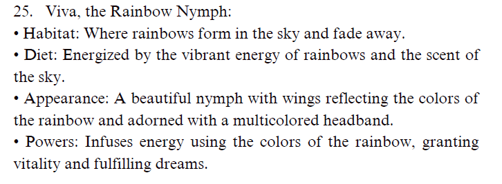 • 외모: 무지개의 색을 반사하는 날개와 다채로운 머리띠를 착용한 아름다운 요정.