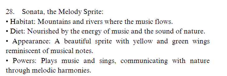 • 외모: 반짝이는 눈과 음악의 파동이 흐르는 듯한 날개를 가진 요정.