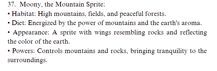 - 외형: 산과 돌을 닮은 작은 날개와 자연의 색을 띤 요정의 모습