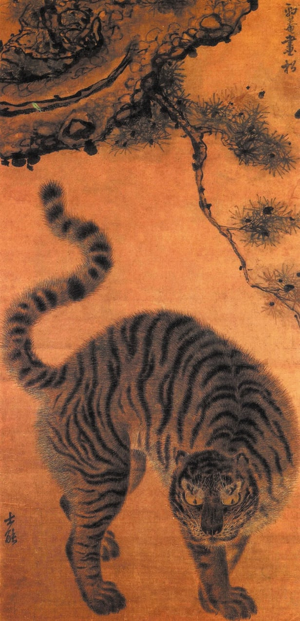 1874년 신재현이 그린 ‘호작도’, 호피 무늬 장막을 그린 ‘호피장막도’와 함께 단원 김홍도의 ‘송하맹호도’도 볼 수 있다. 김홍도 작품은 소나무 아래에서 몸을 돌려 서 있는 호랑이의 자세가 까치호랑이의 원형인 ‘출산호’ 도상과 맞닿아 있어 정통 회화와 민화의 상호 영향을 확인할 수 있다.(ibid)
